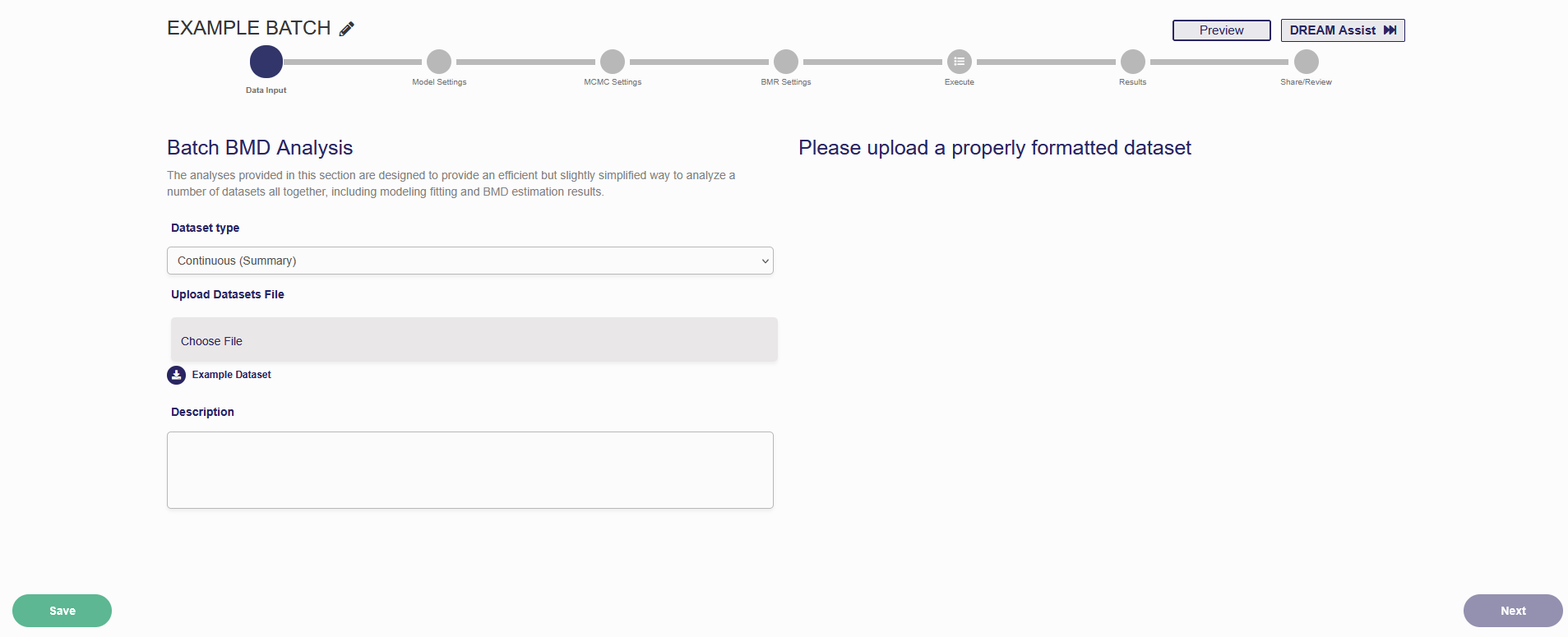 After inputting your dataset, you can add a description to the analysis in the “Description” box. When the dataset is successfully uploaded and a description is added, press “Next” in the lower right corner to advance to the next tab.