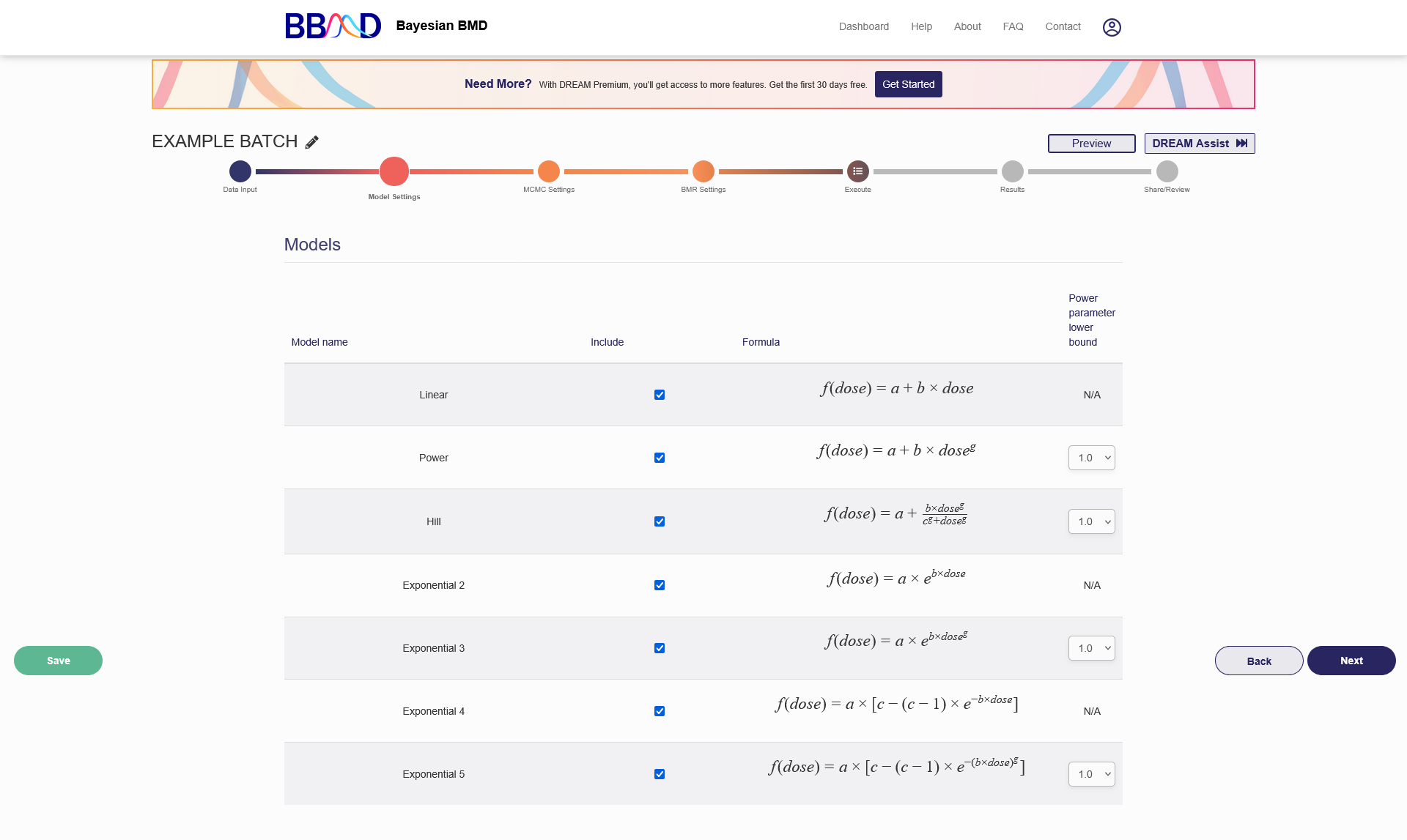 The models available for each data type are slightly different. For dichotomous data the eight available models are: Logistic, Probit, Quantal Linear, Multistage (2nd Order), Weibull, LogLogistic, LogProbit, Dichotomous Hill. For continuous data the seven available models are: Linear, Power, Hill, Exponential 2, Exponential 3, Exponential 4, Exponential 5. For categorical data the eight available models are Logistic, Probit, Cloglog, Quantal Linear, Multistage (2nd order), Weibull, LogLogistic, LogProbit.