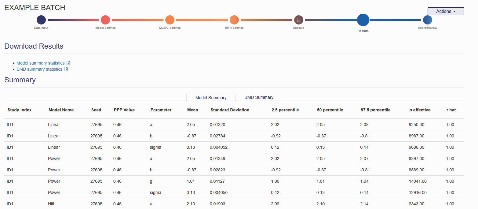 This tab, shown in Figure 3.4, displays the model summaries and BMD summaries for the batch analysis. You can either download the Excel spreadsheet versions of the results or view them in the tables on this page.