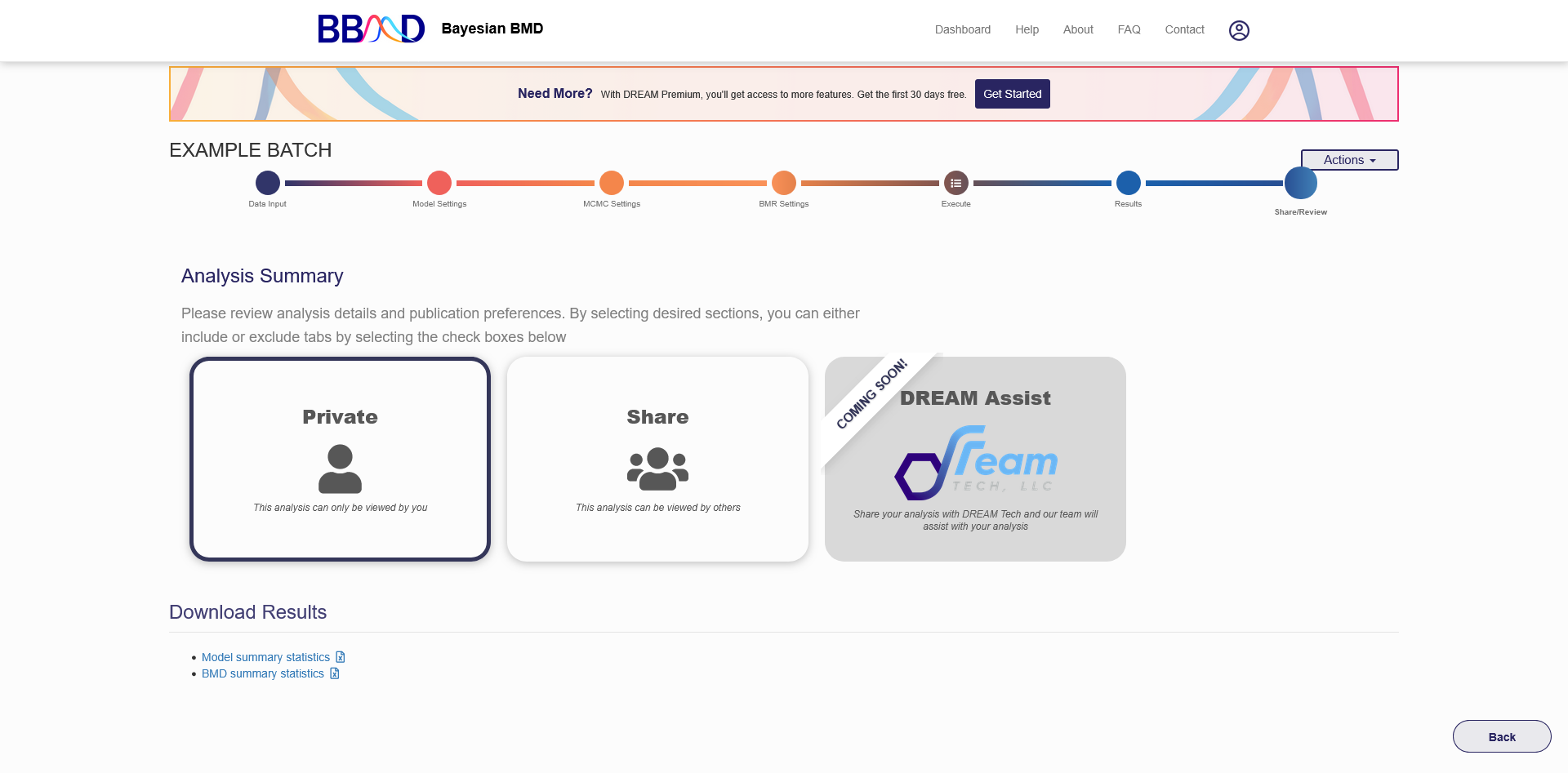 The final tab for this analysis is the “Share” tab, shown in Figure 3.5. By default, all analyses in a personal account can only be accessed by the owner of the account. If you would like to share your analysis with others, you can change the settings from “Private” to “Send Back”, “Share”, or “Dream Assist”. The “Share” setting allows you to send the created URL to others for them to access and review (but not edit) the analysis. The “Send Back” setting allows you to Return to the member that requested the DREAM Assist once reviewed. Lastly, the “DREAM Assist” setting will share this analysis with the DREAM Tech team, who can assist with the analysis. The “DREAM Assist” settings are coming soon.