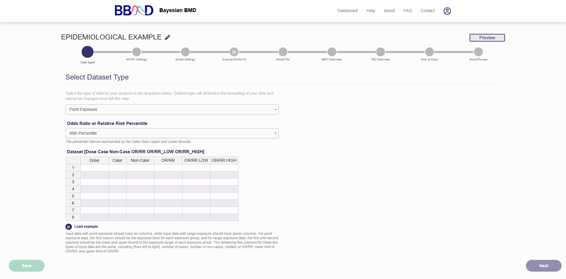 To analyze an epidemiological dataset, you’ll need to input it into the system. An epidemiological dataset has either 6 or 7 columns depending on which exposure type is selected. The first column is either the point exposure or dose or if range exposure is selected there will be two columns one for the lower bound of the exposure and one for the upper bound. These columns are “Dose Low” and “Dose High”. If you’re using range exposure the Dose Low should be the lowest observed exposure in the group and Dose High should be the highest. Next, is the number of Cases then the number of Non-Cases. Next is the Odds Ratio followed by the lower and then upper bounds for the Odds Ratio. Whether you want to use the 95th or 90th percentile as the bounds for the odds ratio can be toggled using the drop-down menu. For an explanation on the Odds Ratio including how to calculate it see here.