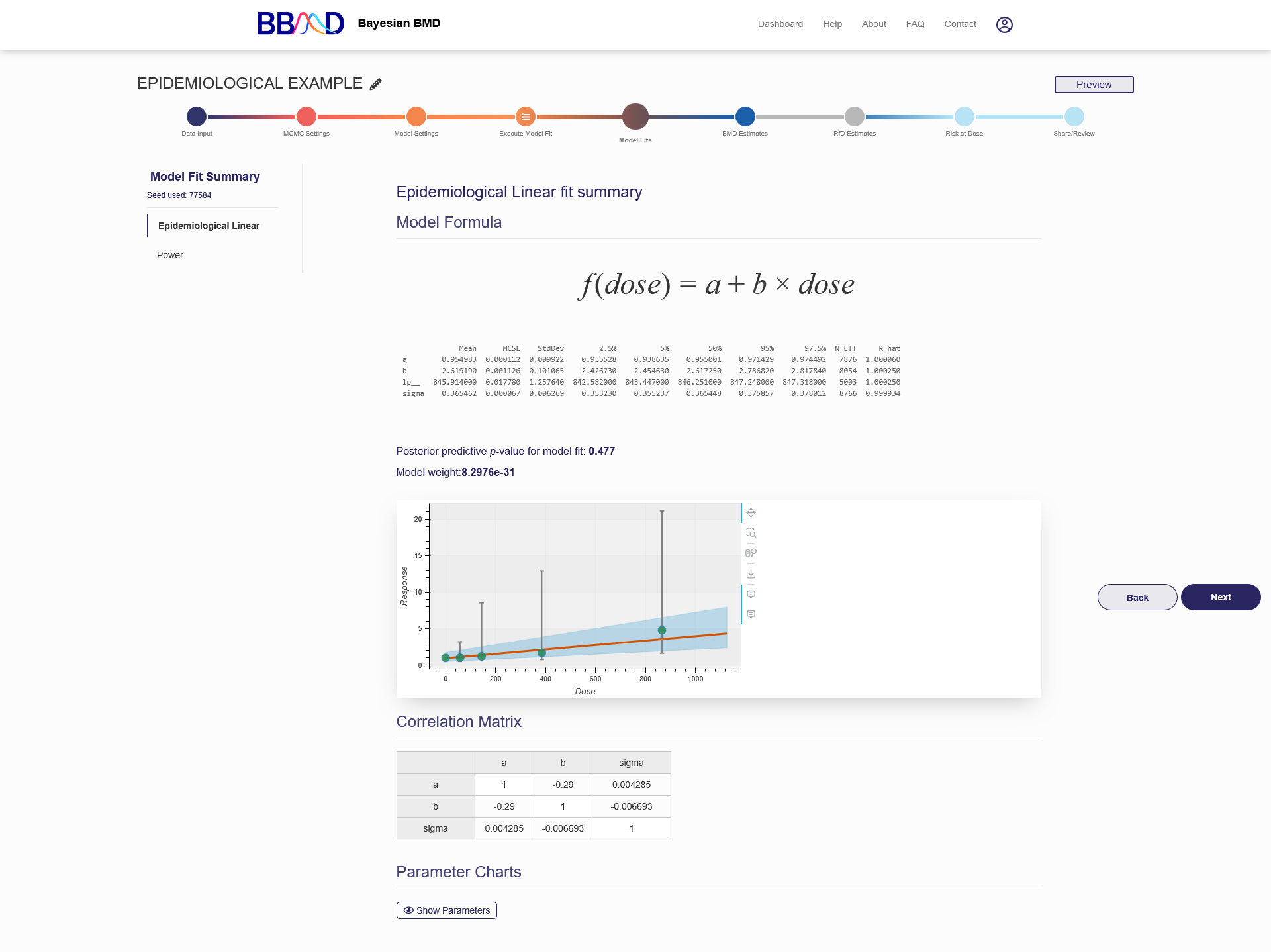 On the “Model Fit Results” tab, the model fitting results obtained from the previous step are displayed. Click the name of one of the models on the left panel, then the results will be shown on the right (as shown in Figure 6.3) These results include the textual output of model parameter estimation, dynamic dose-response plot, posterior predictive p-value, model weight, correlation matrix, and graphical output of posterior sample of the model parameters (hidden by default). When click “Hide Parameters”, the parameter charts for each parameter in the model are displayed as shown in Figure 6.4.