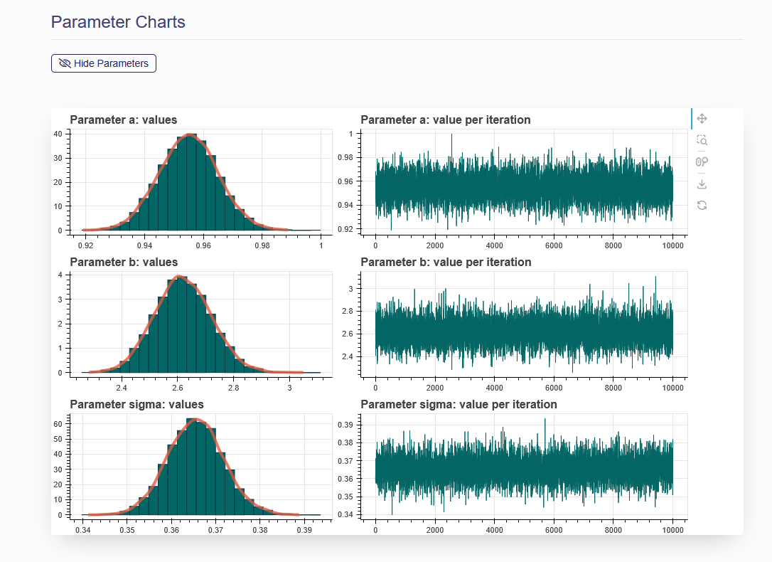 If you click the “Show Parameters” under Parameter Charts, two plots (posterior sample trace plot and estimated probability density plot) will be displayed for each of the parameters in this dose-response model.