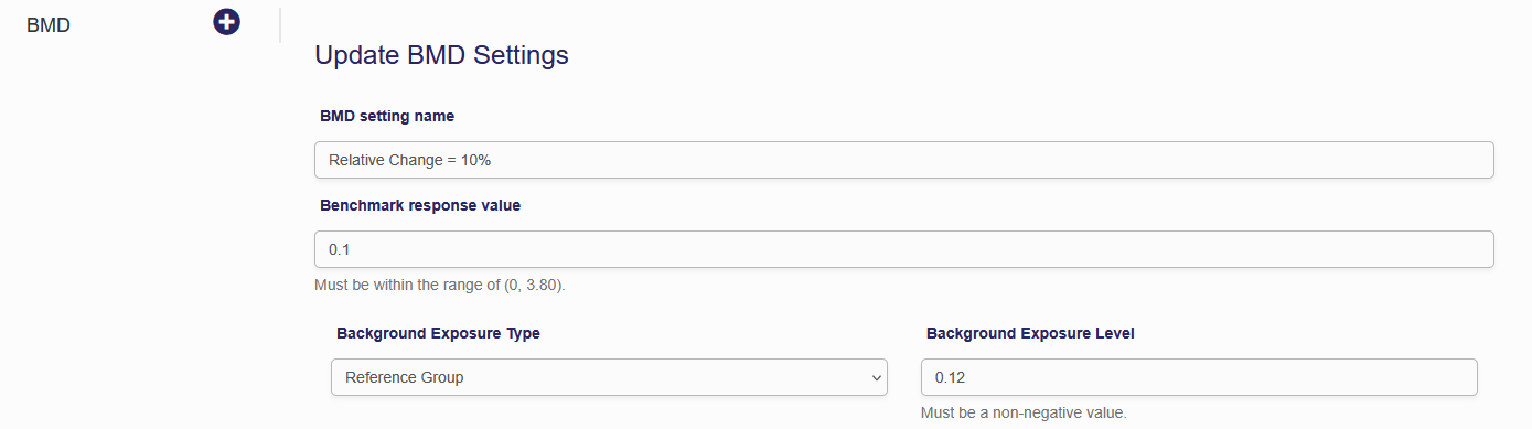 On this page, you can calculate the BMD estimates of your interest. The settings for epidemiological BMD estimates are similar to those for continuous data but differ in a few key ways. For Epidemiological BMDs each BMR is expressed in terms of a relative change from the response at some background exposure level. Figure 6.5 shows the screenshot for epidemiological BMD estimation
