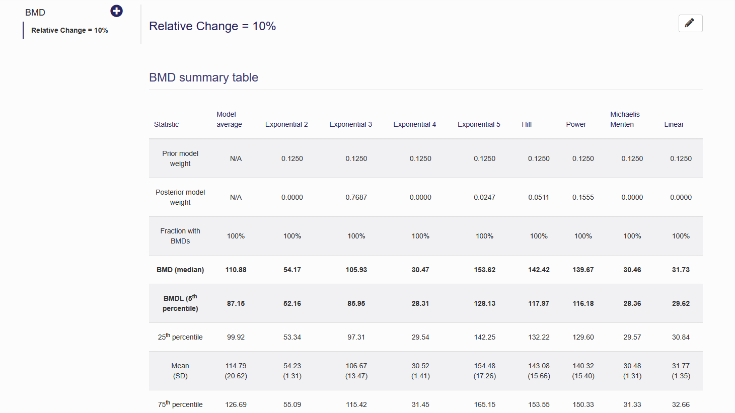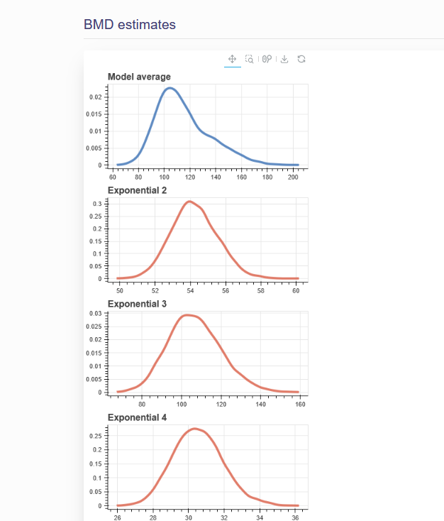 You can change the name of the BMD Settings using the first field. This has no effect on the actual BMD calculations, but does make it easier to navigate the BMD settings page when you have multiple BMDs. Next is the “Benchmark Response Value”. The BMR is expressed in terms of relative change from the background value. There are three options to specify the “Background Exposure Level”. Each option can be selected from the drop down menu. The first “Reference Group” sets the Background Exposure Level equal to the lowest exposure group. If you’re using an exposure range this value is the halfway between the lower and upper bounds of the range. The second background exposure option is to set the background exposure to zero. Finally, the “Custom” option allows the user to set the background exposure to any value. The system also allows you to specify the prior weight for each model. These prior weights should not consider the model fits on the previous tab as this information is already included in the algorithm to calculate the posterior weights. After you specify the settings click “Execute” to calculate the BMD.