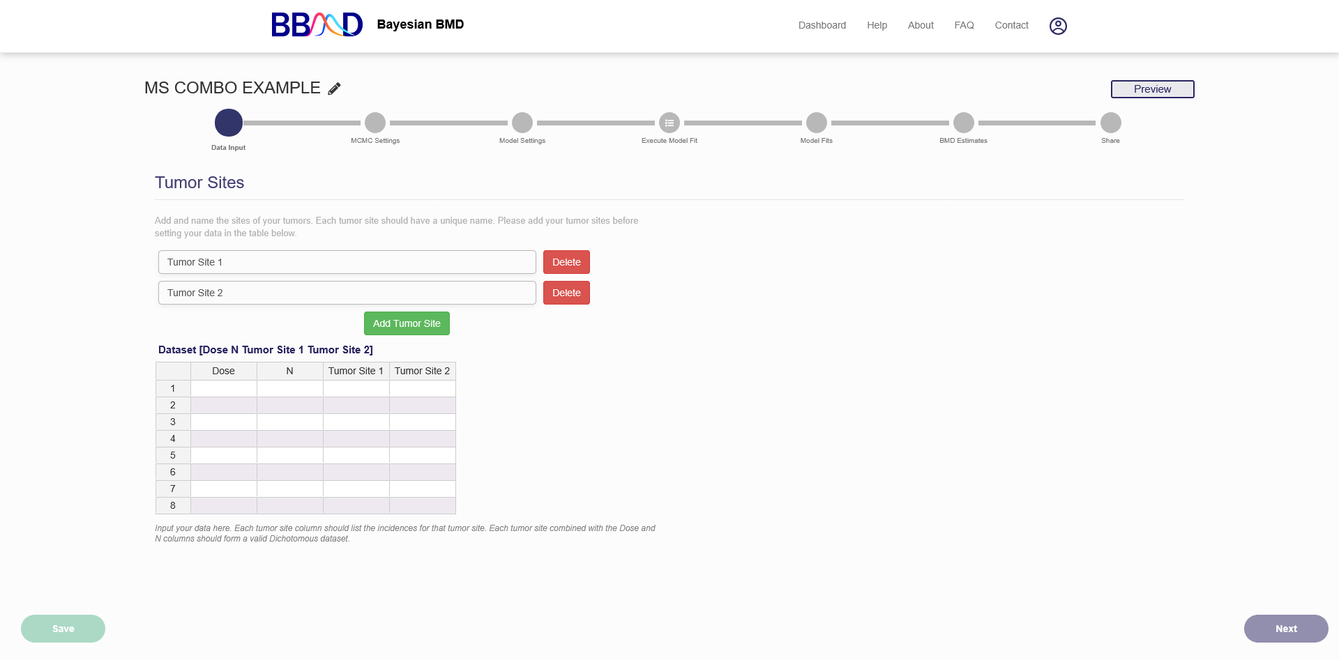 To analyze a dataset, you’ll need to input it into the system. A Multisite Tumor dataset is made up of several dichotomous datasets combined together. Like a dichotomous dataset the first two columns are the dose and the sample size (N). Then each Tumor site should have the incidence for that tumors at that particular site listed in its column. So if you have a control group with 50 animals and three with a tumor at Tumor Site 1 and four with a tumor at Tumor Site 2 the first row of your dataset would be 0 50 3 4. This is true regardless of whether an animal has tumors at sites 1 and 2 or not.