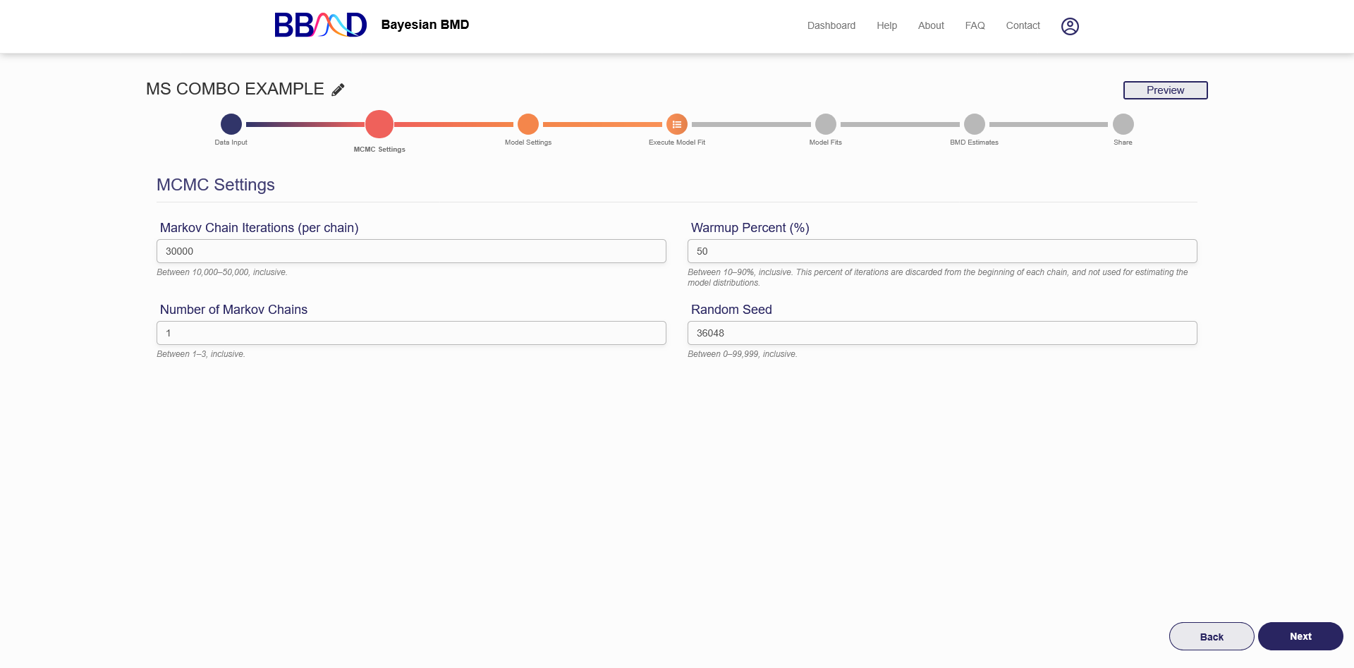Once these values are specified, click “Next” to save the MCMC settings and move to ‘Model Settings’. Default settings are generally acceptable. However, results in the next step will provide important information that can help you judge if the MCMC settings are appropriate. Based on our testing, the default settings are adequate for most of the commonly seen dose-response shapes, so we suggest you use the default settings for your initial run.