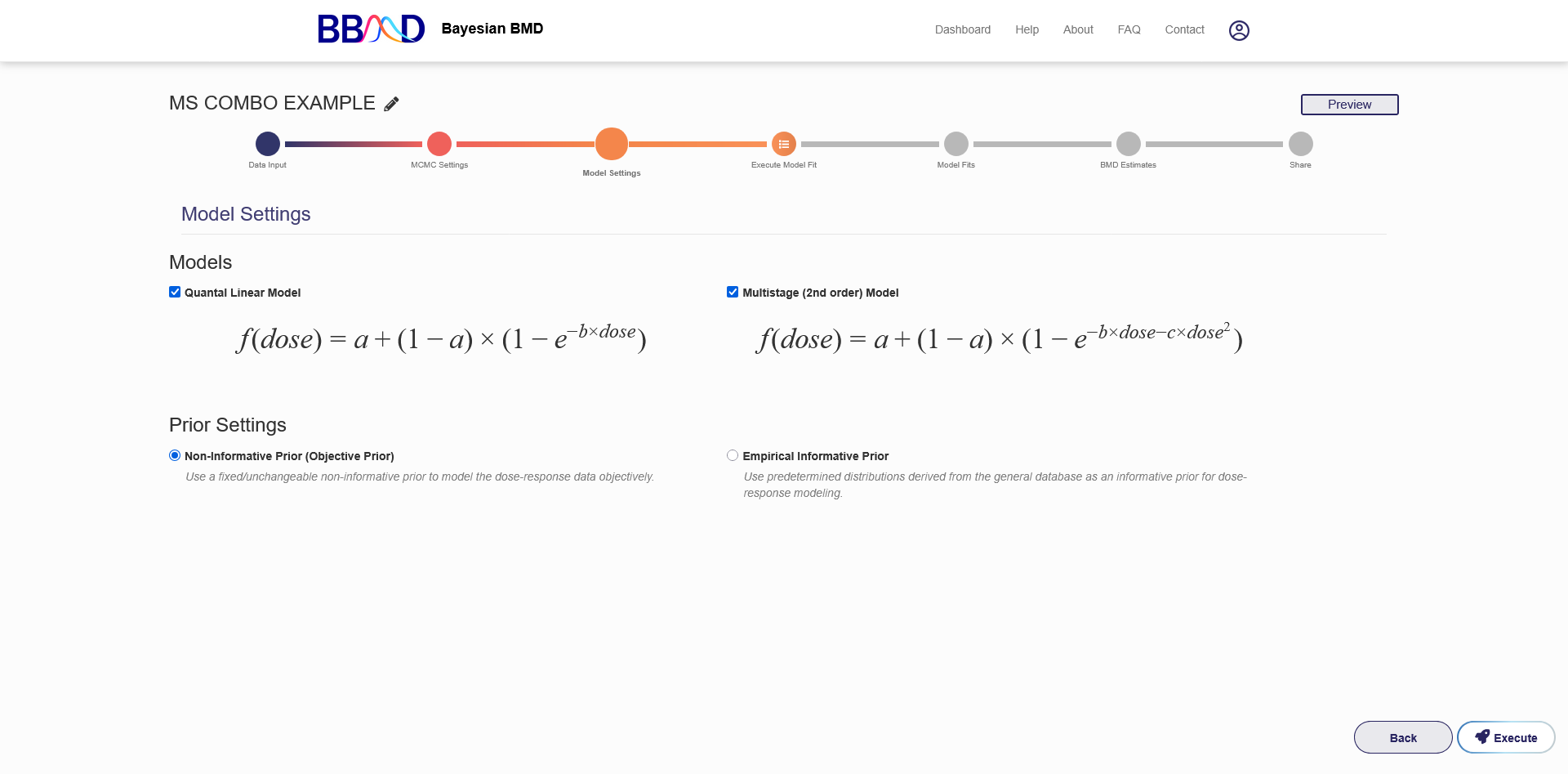 After the MCMC settings tab is the model settings tab. In this tab (Figure 7.3) you choose which dose response models to fit to your dataset. Due to the assumptions made about conditional independence only two of our 8 dichotomous models are suitable for the Multisite Tumor module. They are the Quantal Linear and Multistage models. Each model can be included by checking the associated box or excluded by unchecking the box. You can choose whether to use our objective priors or our empirical informative priors from the prior settings menu. At least one model must be selected before clicking “Execute”.