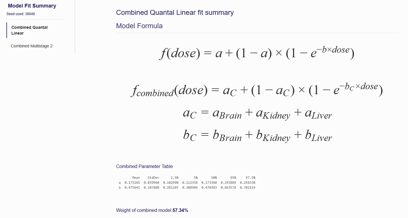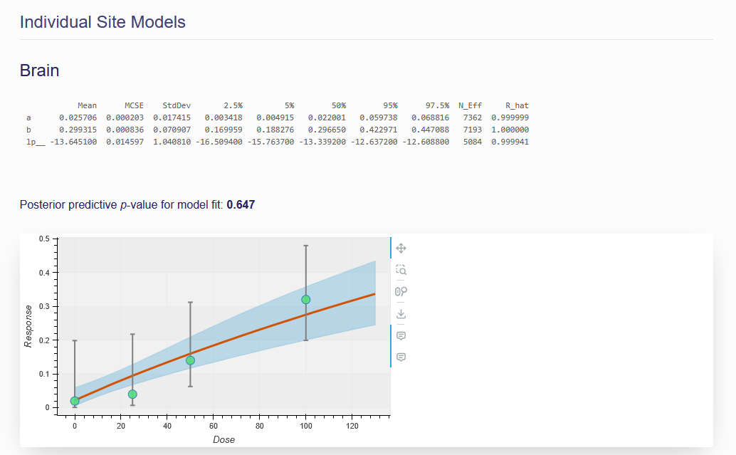 The models for each individual tumor site are shown under the combined model. Each individual model has its own textual output table, interactive dose response plot, and posterior predictive p value displayed.