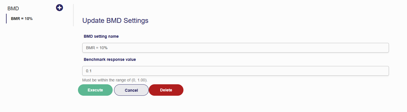 You can change the name of the BMD Settings using the first field. This has no effect on the actual BMD calculations but does make it easier to navigate the BMD settings page when you have multiple BMDs. Next is the Benchmark Response Value. The BMR is calculated using both the added and extra risk definitions.
