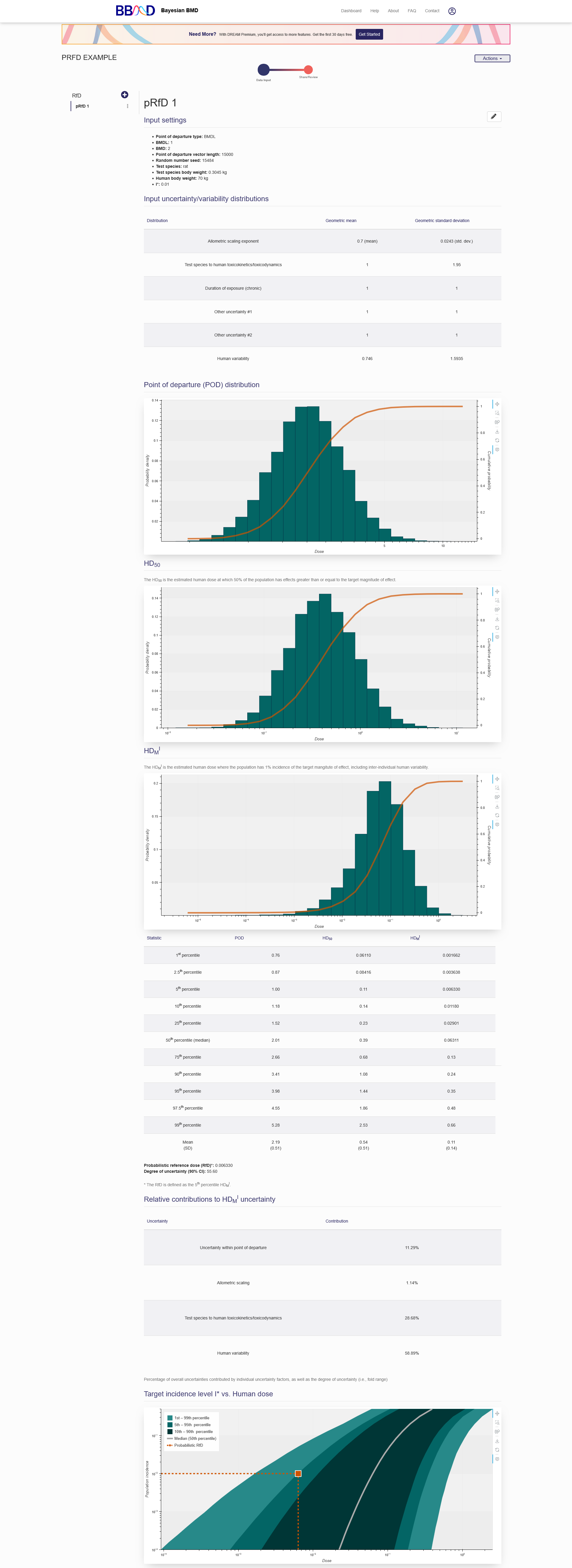 With the derived point of departure (POD) from an animal model and the user defined uncertainty factors, this POD is extrapolated to the equivalent human exposure (e.g., daily oral equivalent dose). Based on the dose response relationship of human extrapolation, the HD50 (50% of the population has effects greater than or equal to the target magnitude of effect) and HDMI (estimated human dose where the population has 1% incidence of the target magnitude of effect, including inter-individual human variability) are derived on the RfD results page. The dose-population incidence curve below the summary table gives a visual expression of the statistic values in the HDMI table. In addition, the contributions of uncertainty from each individual uncertainty factors are also summarized in the table on the RfD results page.